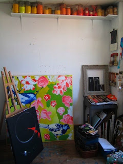 Elle peint souvent des séries qui lui permettent de décliner une technique ou un thème, souvent les deux à la fois. Elle peint sur toile (des draps anciens sur châssis) avec des couleurs qu'elle fabrique à partir de pigments.